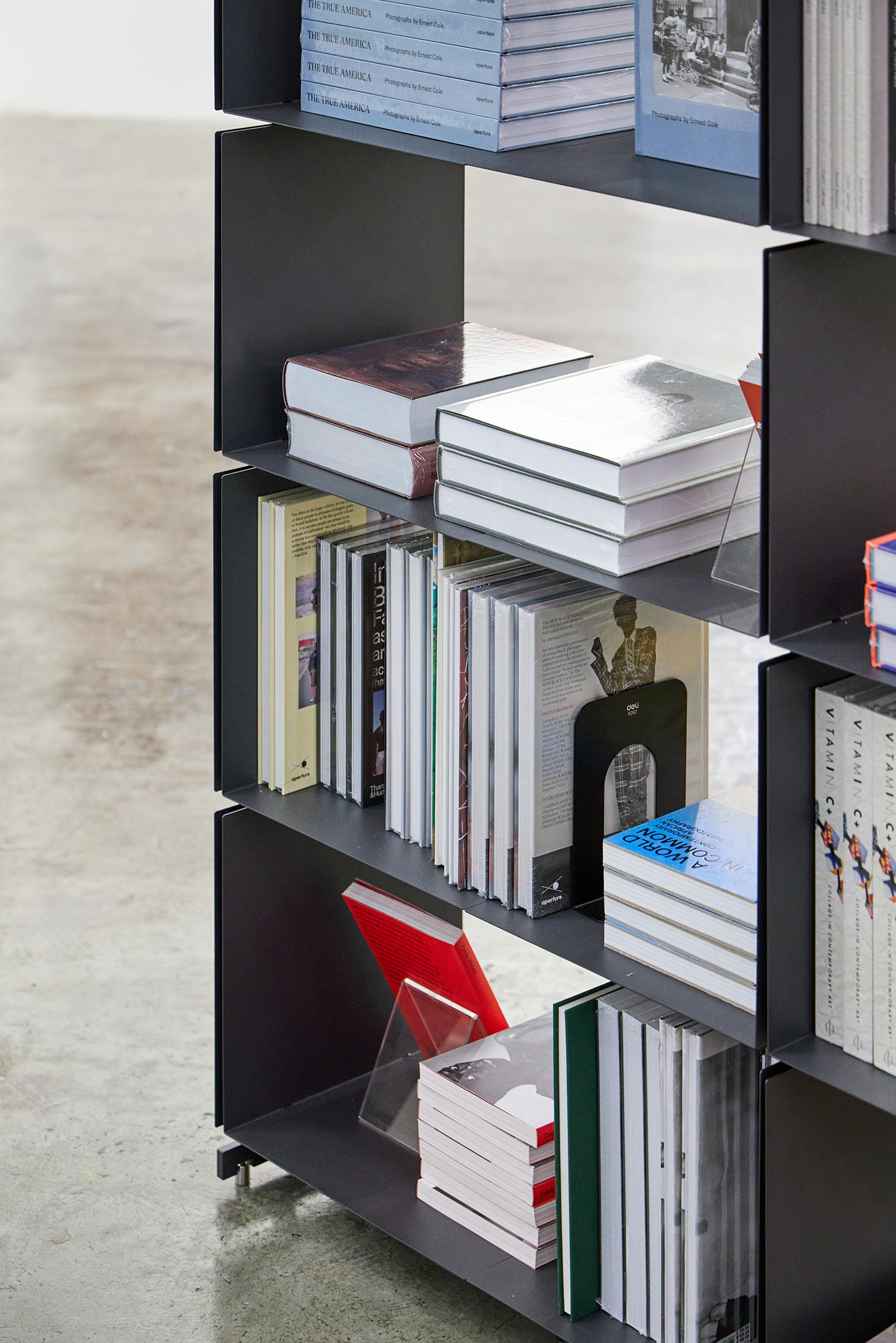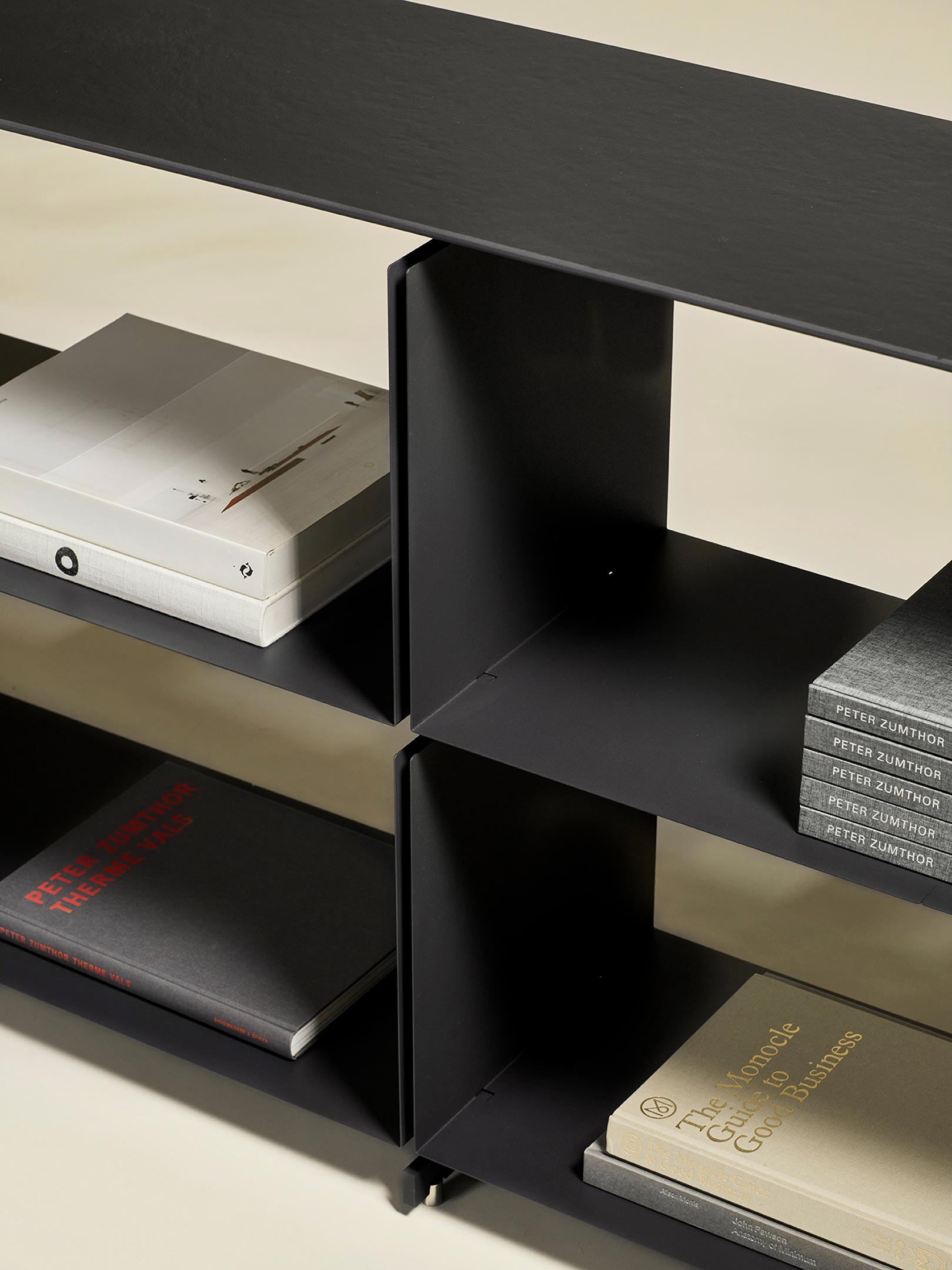 Laser-cutting and waterjet-cutting processes are applied to various parts of the shelving, depending on the length and complexity of the profile. Once assembled, the loosely fitted L-shaped shelves securely lock into place without any mechanical fixing, ensuring the stability of the free-standing bookshelf structure. The shelving is then finished with a ferrograin coating.