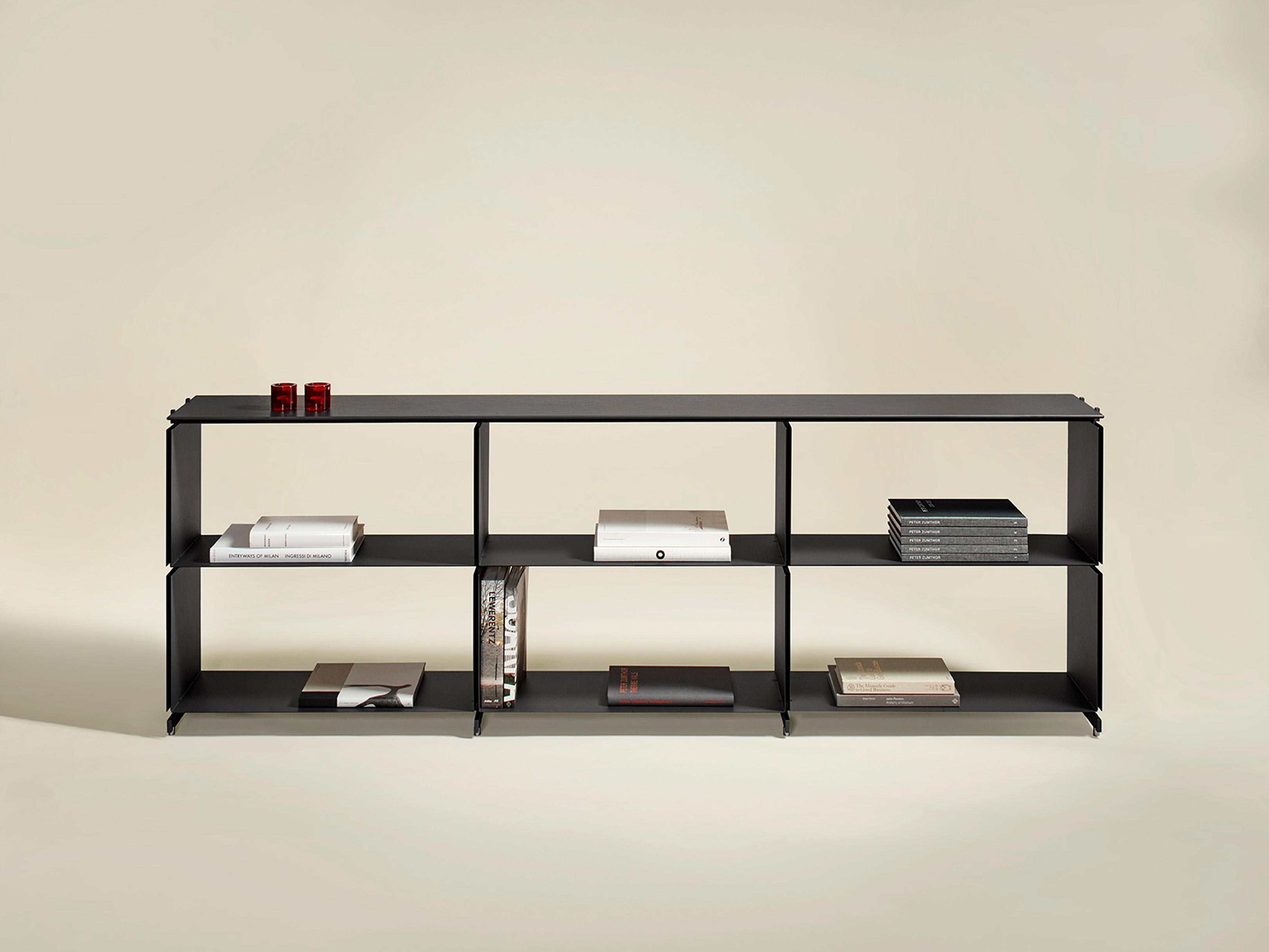 Assembled with machine screws, the shelving system pairs engineered precision with a refinement of form that renders its solid construction seemingly insubstantial.