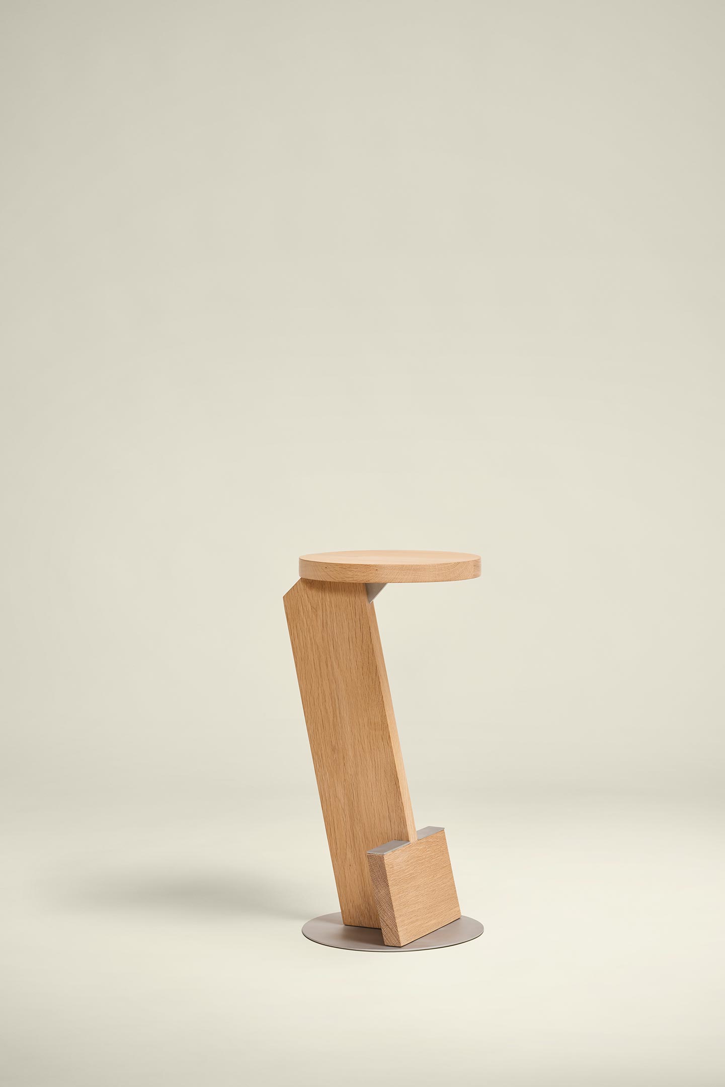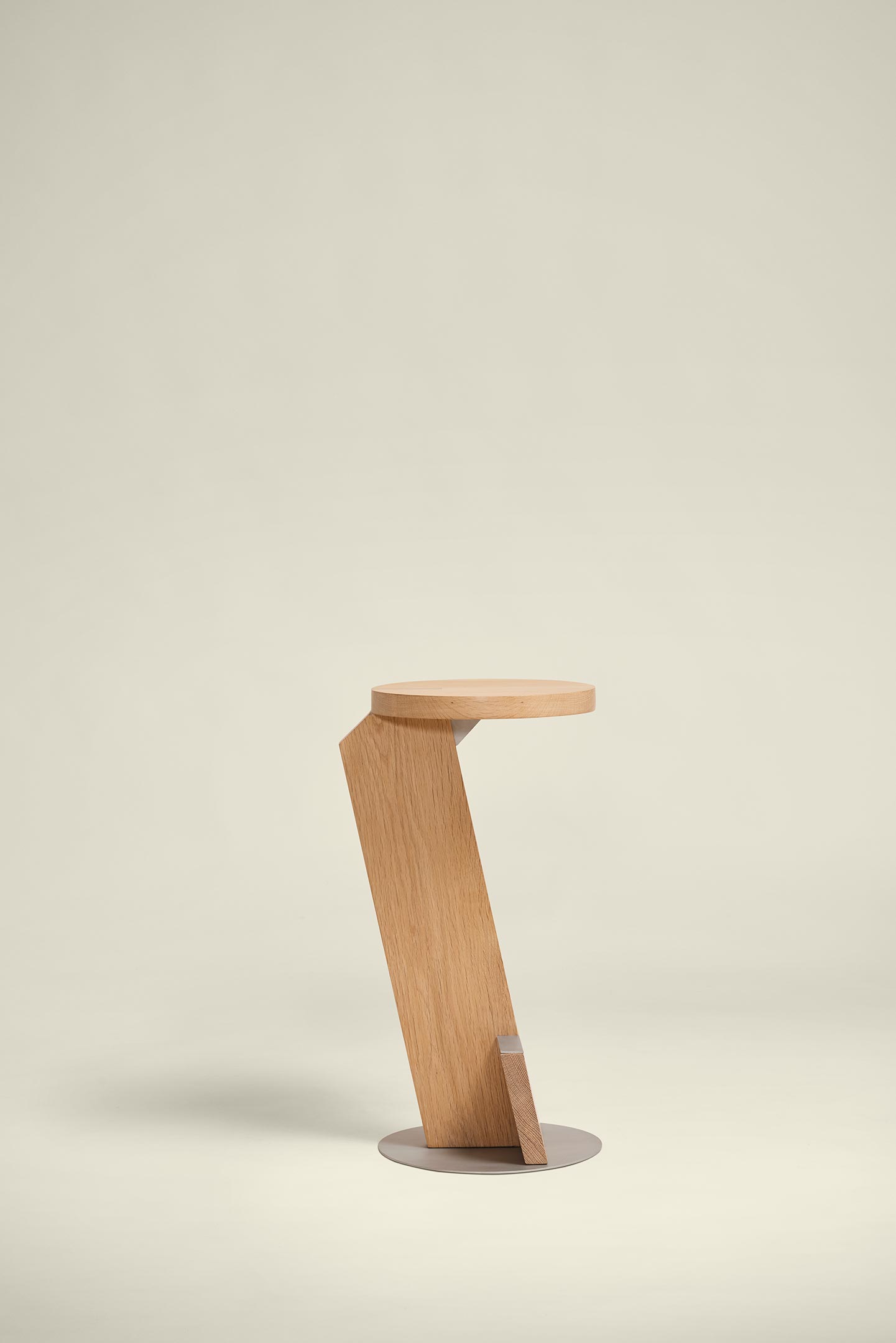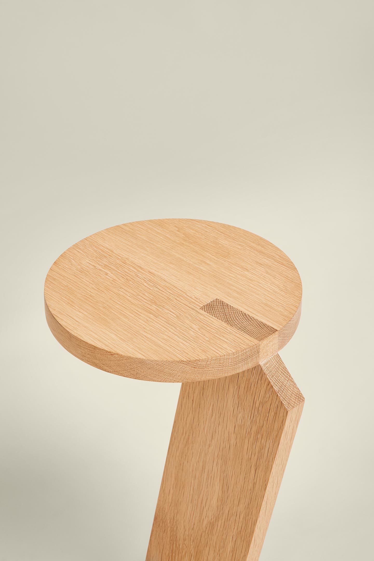 The MŪ262 stool is crafted from solid oak components. Each element is machine-cut for precision and then hand-assembled, with particular care given to the junction between the seat and the angled base.