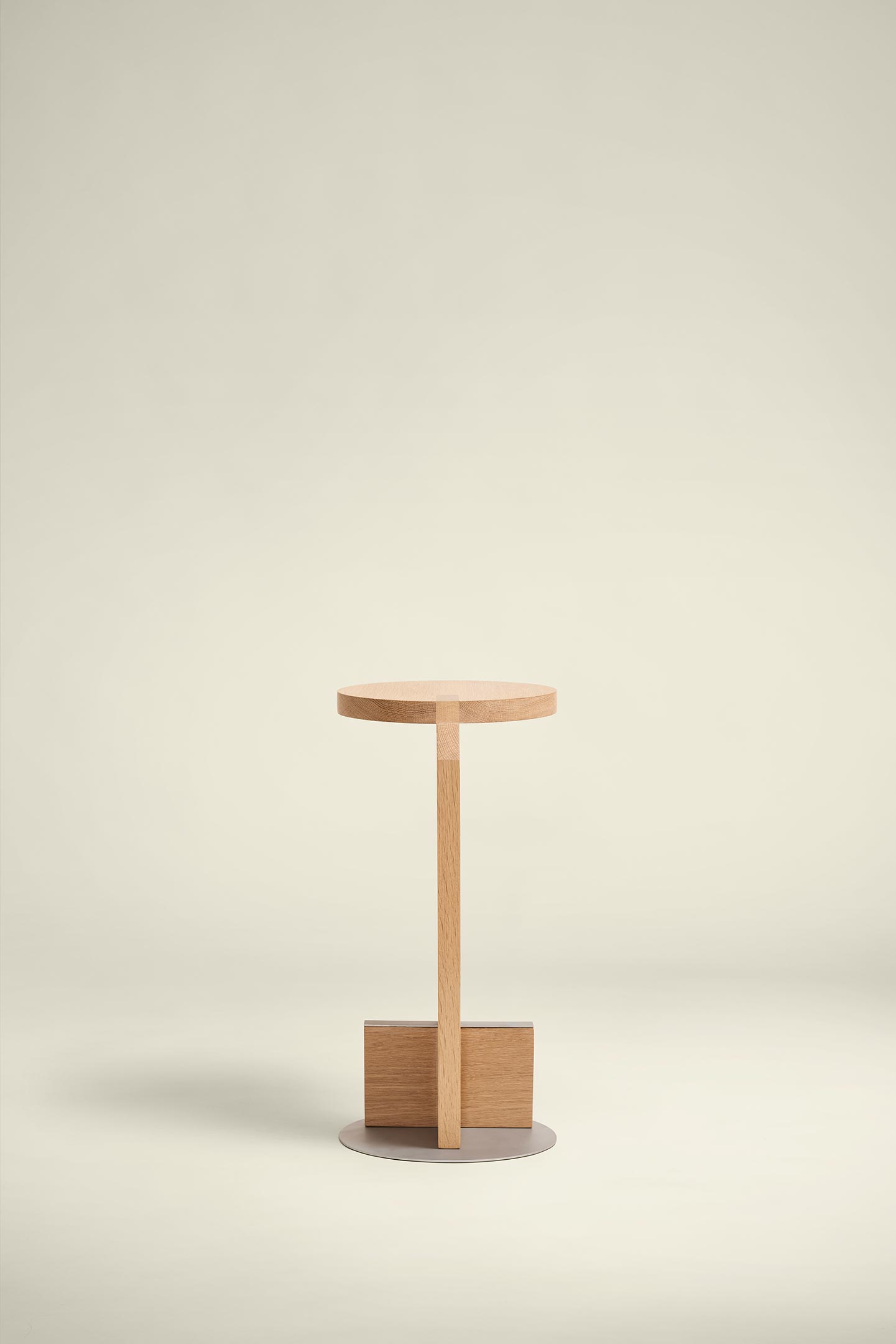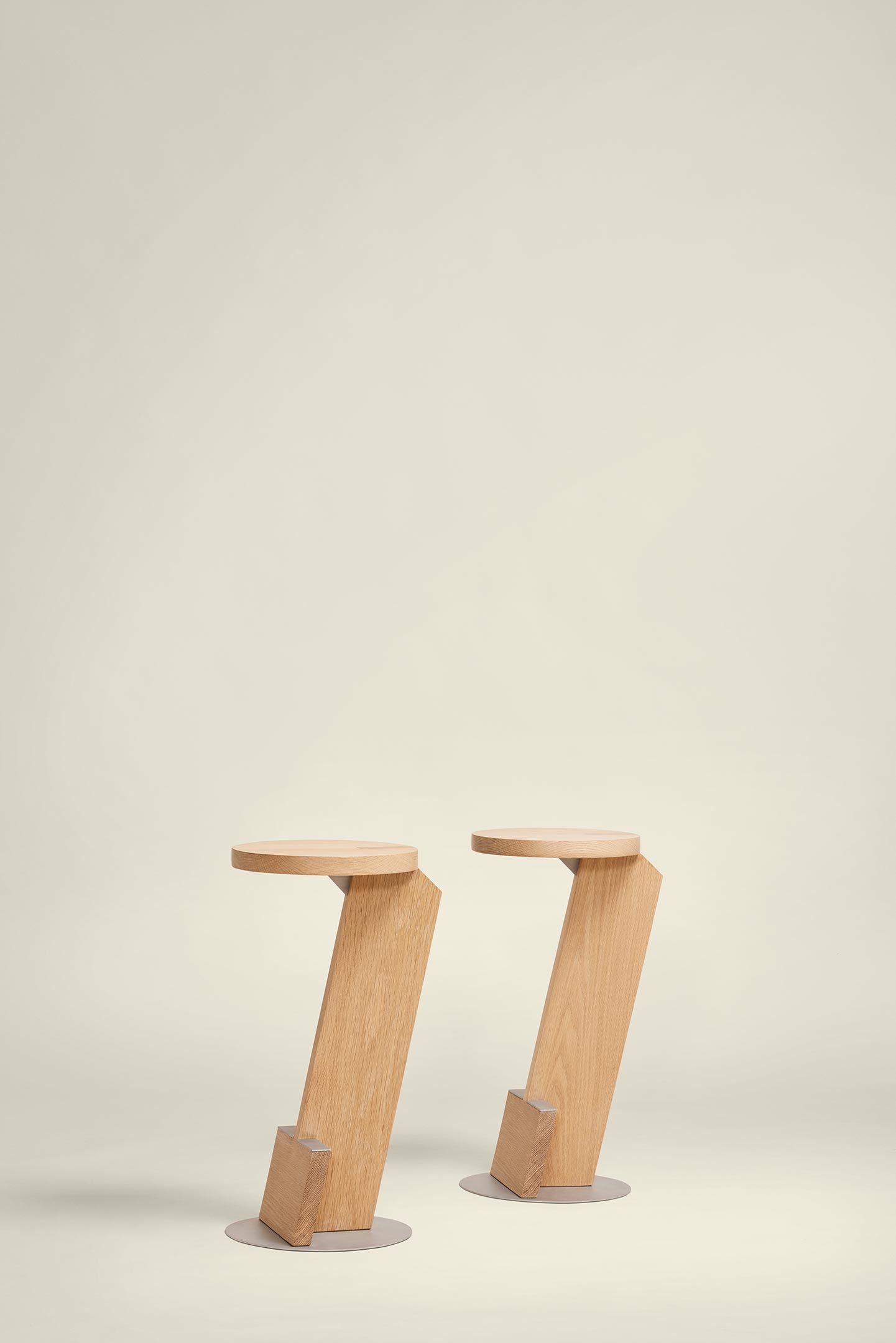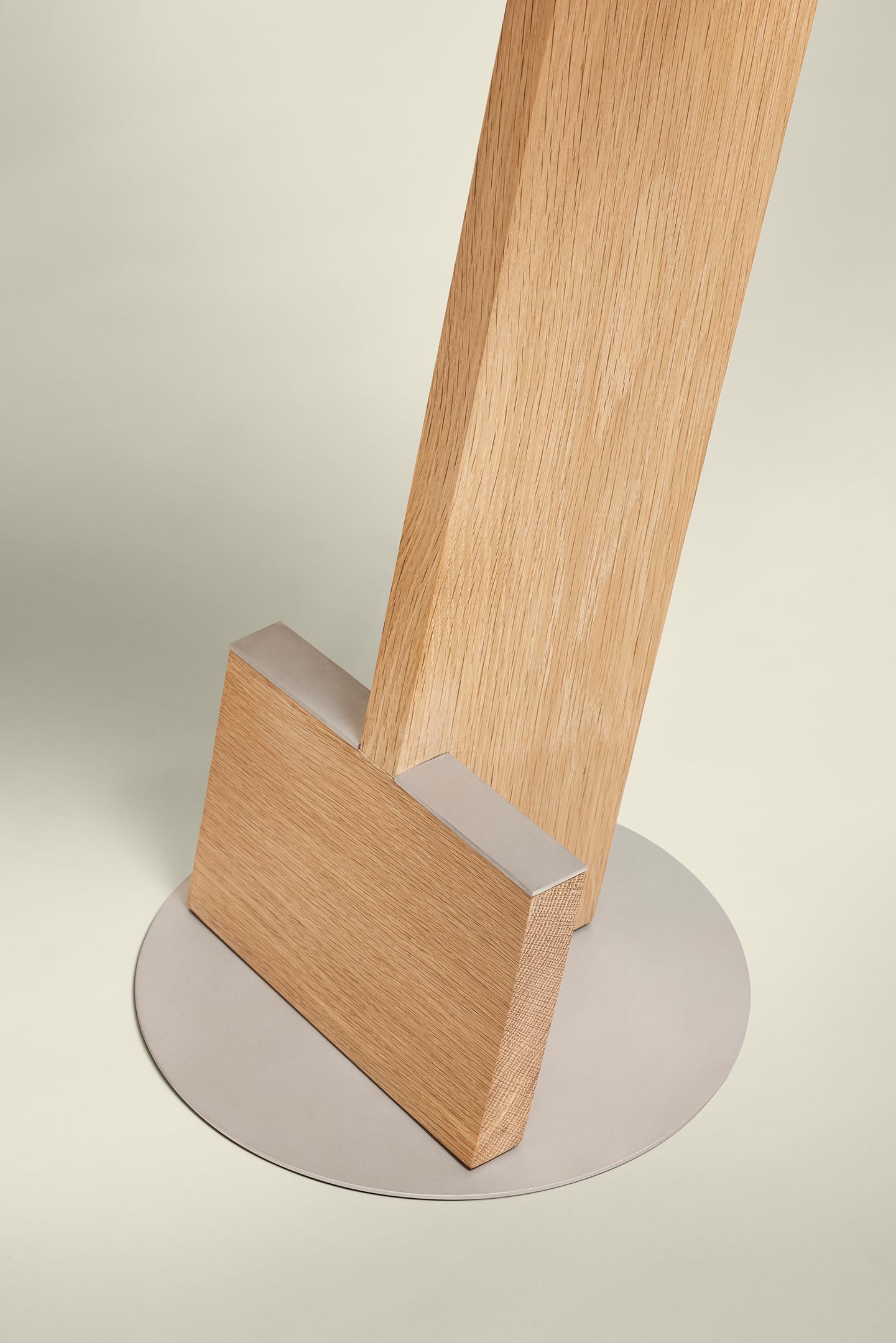 The MŪ262 stool is crafted from solid oak components. Each element is machine-cut for precision and then hand-assembled, with particular care given to the junction between the seat and the angled base.