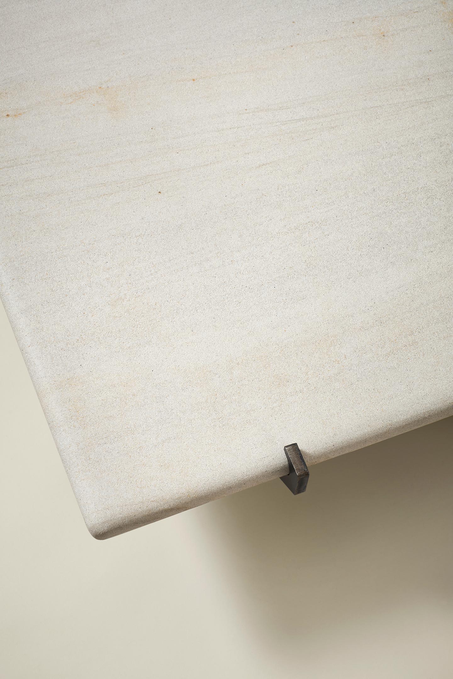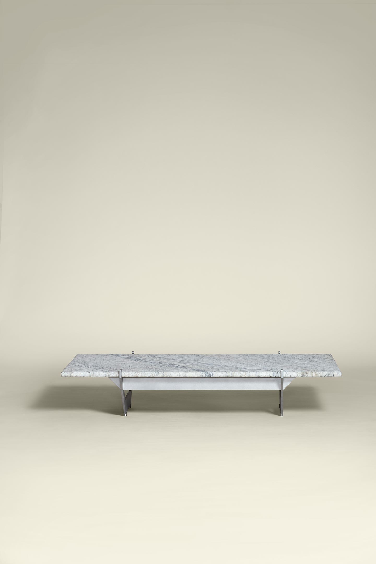 Pairing steel and stone, the coffee table emphasises the meeting of these two elemental materials at the construction’s unifying junctions: the weight of rock made seemingly insignificant by the tapering metal that supports it.
