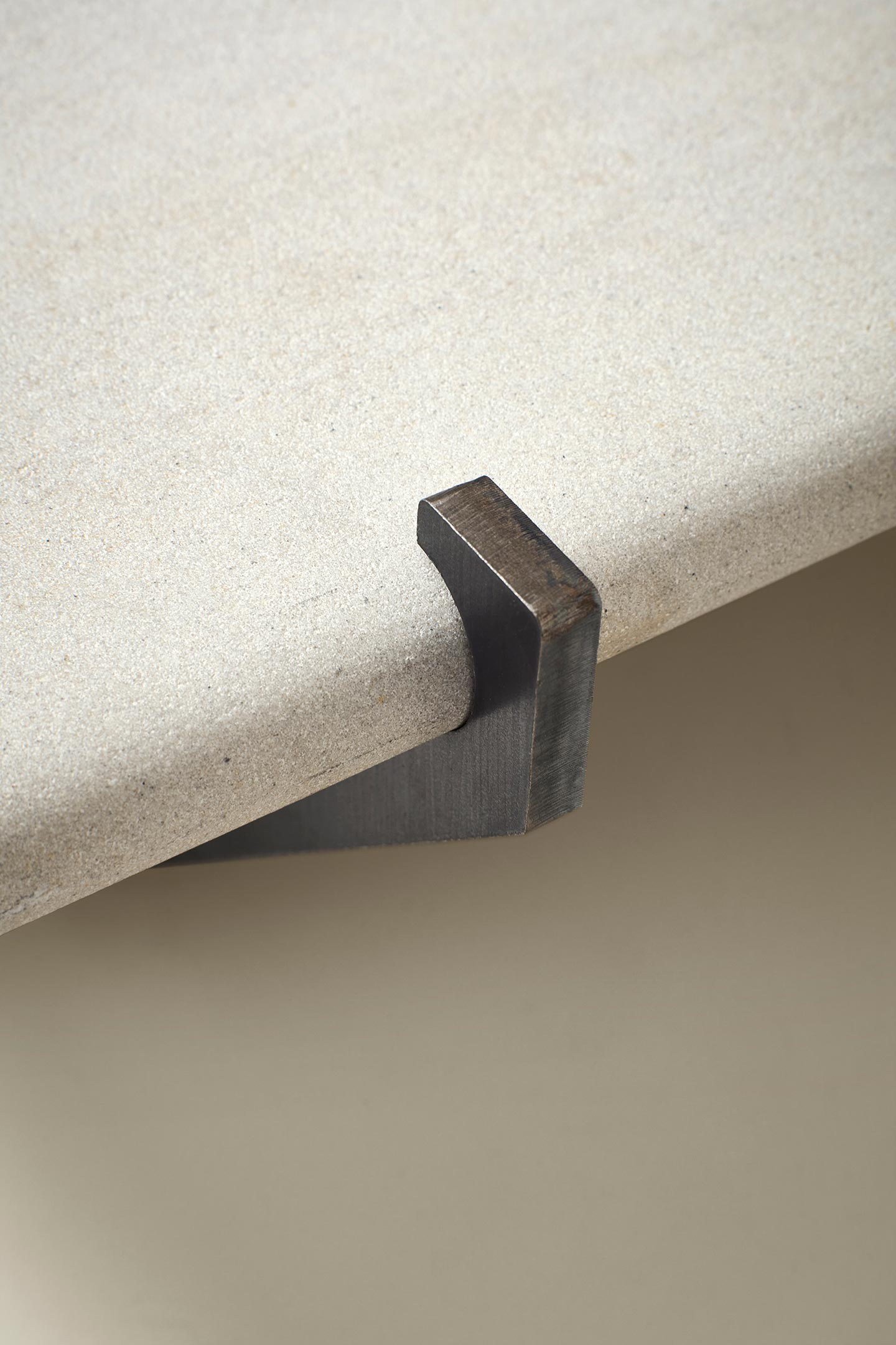 The MŪ311 coffee table features a framework made from 10 mm thick 3CR12 steel, laser-cut and assembled without mechanical fasteners. A solid stone top, 32 mm thick with a full bull-nose edge, is neatly set into the structure.